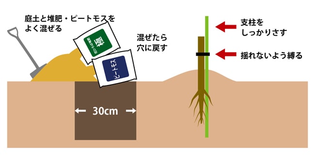植え付けたばかりの苗が横風で揺れないように、支柱をたてて幹と固定します。支柱を挿す際に多少根をついてしまっても大丈夫です。幹に当て布をして幹が傷つくのを防ぎ、麻紐などで幹と支柱を固定してください。