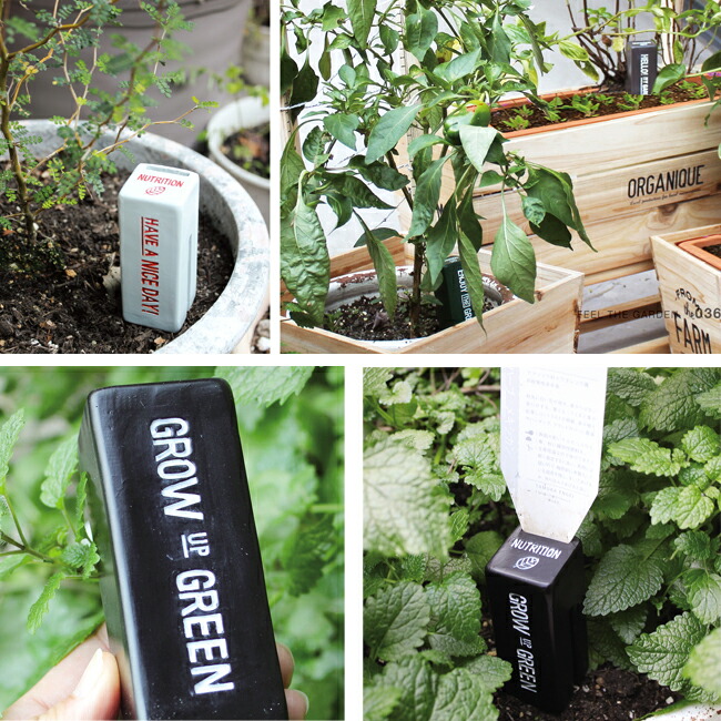グリーンを育てるメッセージが入った栄養剤カバーです。上部には園芸ラベルが挿せる穴が開いていて植物の管理もしやすく、さらに栄養剤の残量がわかる小窓付きなので交換のタイミングが分かりやすい!栄養剤を使わない時も、オブジェとしてプランターに飾っても素敵です。