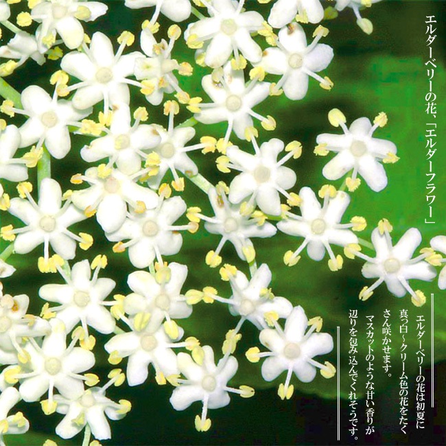 エルダーベリーの花をエルダーフラワーと言います。初夏に一斉に真っ白~クリーム色の小さな可愛い花を直径10~20cmの房にして沢山付けます。花はライチやマスカットに似たフルーティーな香りで、辺り一面に爽やかな香りが漂います 。欧米では花を乾燥させハーブティーにしたり、よく煮出して汁を濾しエルダーのハチミツシロップも人気です。