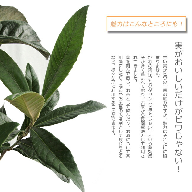 多くは果樹として栽培され、放任すると高さはおよそ10メートルほどになります。葉は濃い緑色で大きく、長い楕円形をしていて、表面にはつやがあり、裏には産毛があります。その大きな葉陰に楽器の琵琶に似た形をした一口大の多くの甘い実がなります。庭木としても楽しめ、 木そのものはある程度寒さに強いのですが、冬に花が咲き寒さで傷むので、果実を楽しむ場合は暖地での栽培をオススメします。寒冷地で育てる場合は開花が遅めの晩生種が良いです。