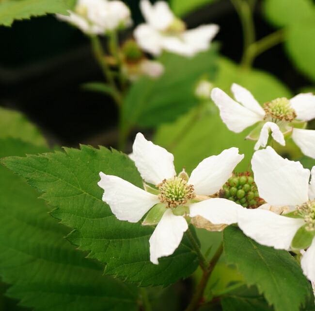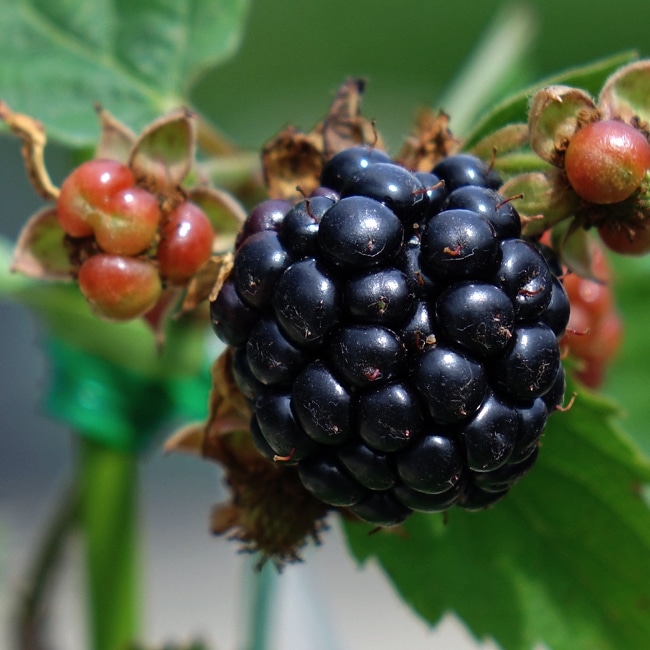 果実は小さな球形の実の集合体で、一つ一つに種子が入っています。種はゴマ程度の大きさで、種ごと食べられるますが。種はやや口当たりが悪いですが、優れた風味・甘味・酸味がありジャムや洋菓子などによく用いられています。ブラックベリーの果実にはブルーベリーの約6倍のアントシアニンが含まれています。抗酸化能力があり、健康フルーツとして注目されています。ラズベリーと違い、ポロっとは取れませんので、ヘタをつけたまま鋏などで切り取って収穫します。