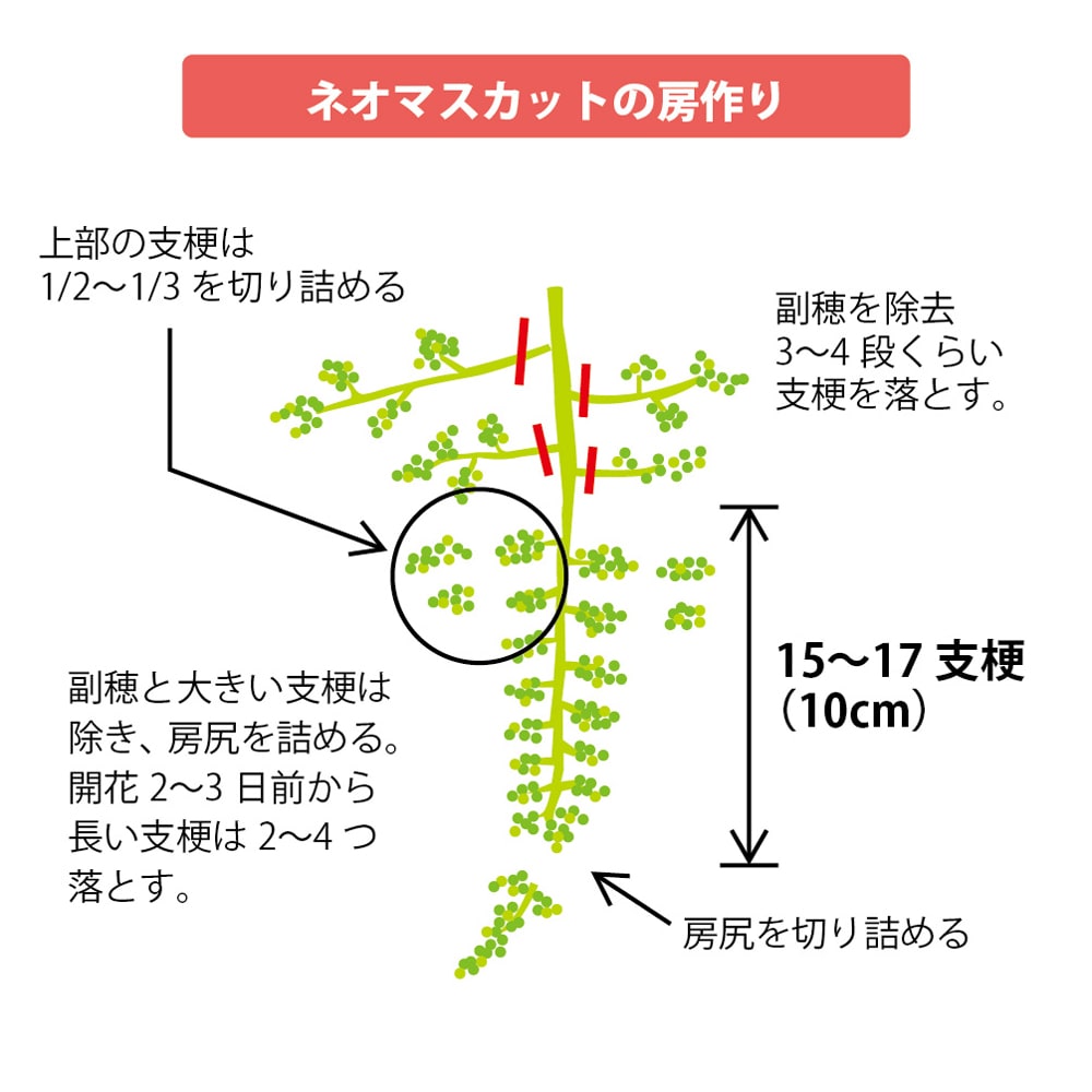 ネオマスカットはジベレリン処理はしませんが、花ぶるいしないように房づくりをします。時期は花穂が伸び切ったころ、花が1~2輪咲いたころに房づくりします。