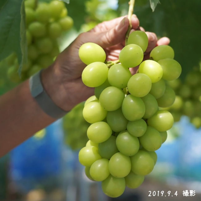 房は円筒形で400~500グラム。成熟時の色は黄緑色で、粒は短楕円形。大きさは11~13gと巨峰と同じ程度です。糖度は20度程度で高く、酸含量は0.3~0.4 g/100 mLと低いので甘さが際立ちます。大粒で果肉は硬く、マスカット香があり、酸味が少ないのでとてもおいしく、大人気の品種です。めったに裂果しません。