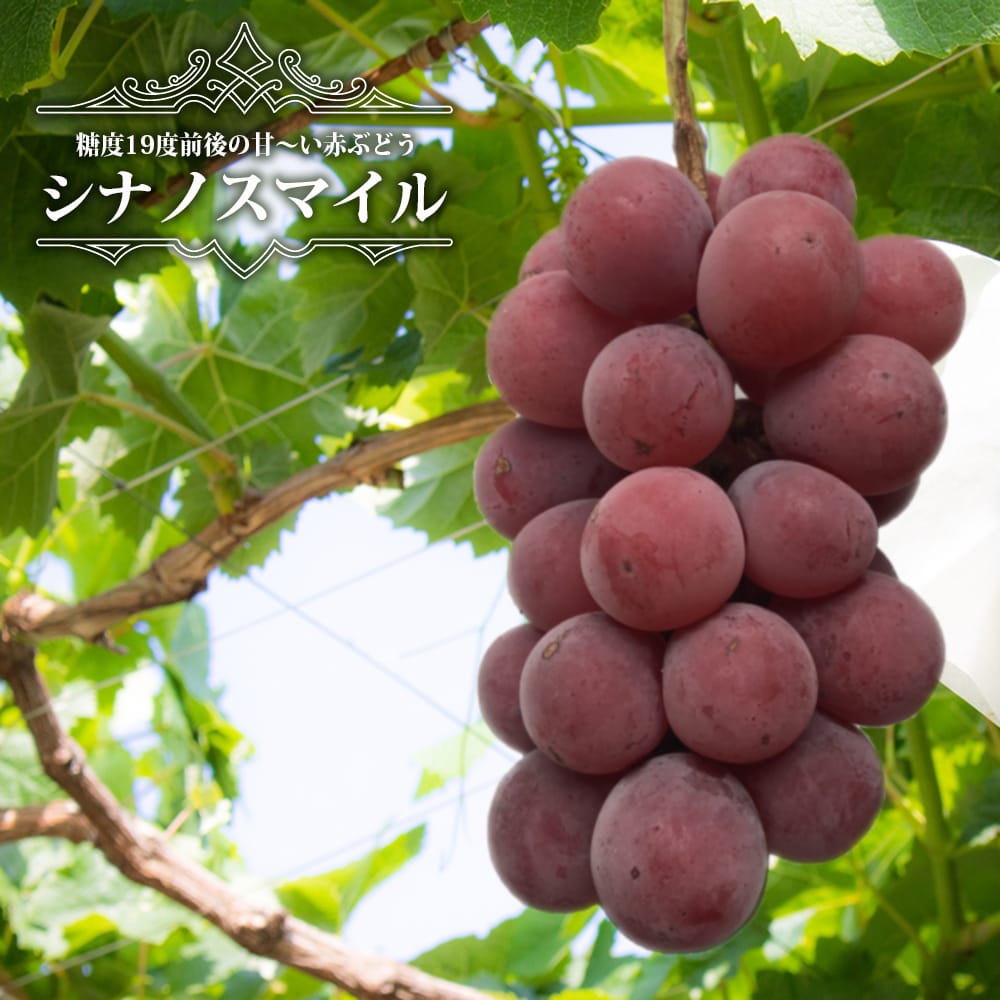 シナノスマイルは「高墨」の自然交雑実生から誕生した 平均糖度19度前後の大変甘い赤ブドウです。果肉はとてもジューシーで、しっかりしています。収穫期や、甘さなど粒の大きさなど、クイーンニーナに似ています。