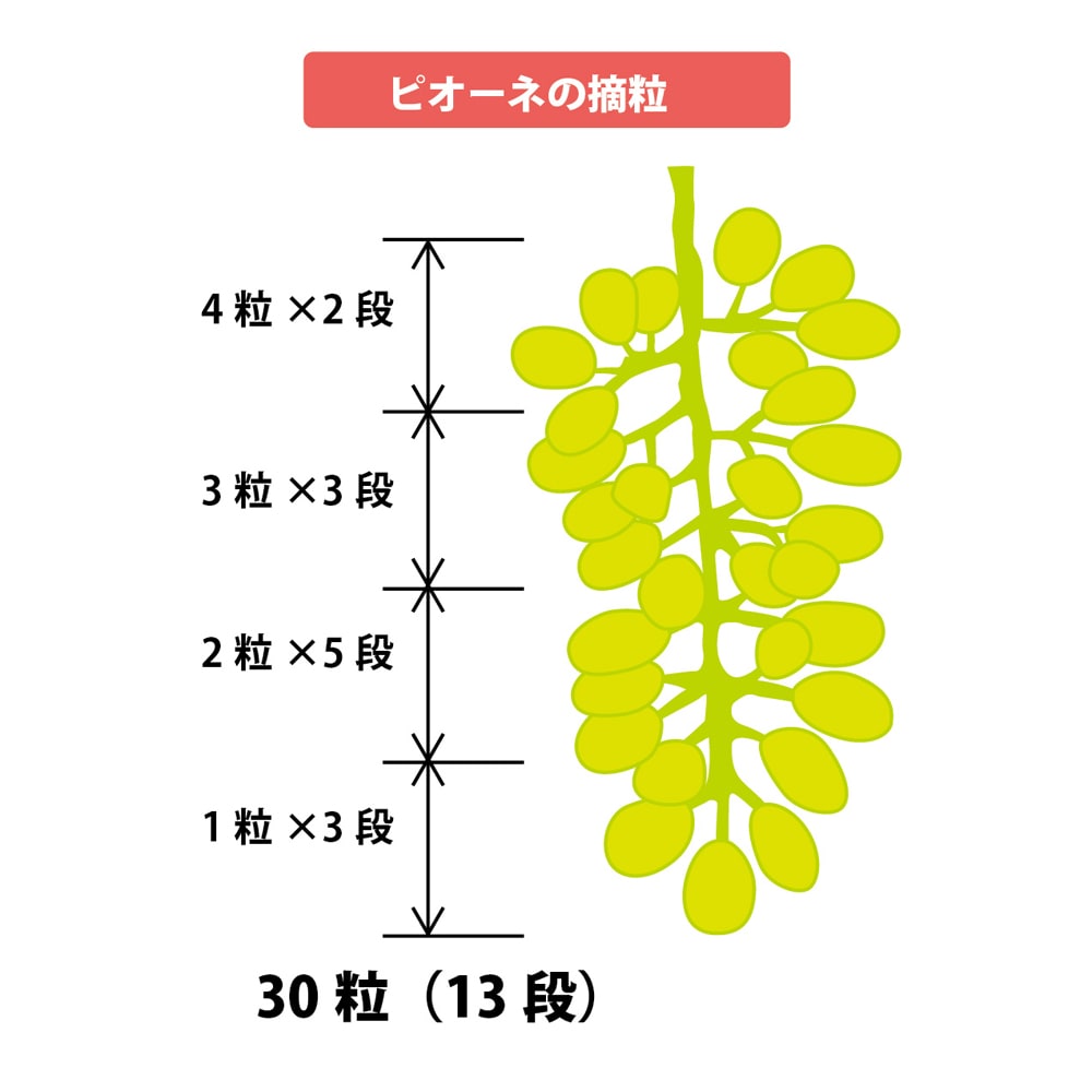 ピオーネと同様に35~38粒くらいに摘粒するのがおすすめ。摘粒は3回に分けて1回目はなるべく早く行い、果粒肥大促進と新梢伸長を促します。