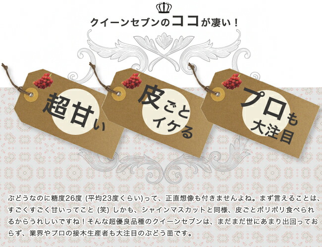 クイーンセブンはシャインマスカットとマヌキュアフィンガーの交配種です。皮ごと食べられる早生系赤品種です。このクイーンセブン。普通のぶどうとはちょっと違うんです!まずあまり売っていません (笑) そして驚くべく最高糖度27度がどれくらいスゴイかと言うと、イチジクの糖度が高い品種と同じくらい。でも、ぶどうには酸味もありますよね。イチジクには酸味がほとんど無いため、口に入れた瞬間、濃厚な甘さが広がりますが、このクイーンセブンは、酸味もあるのにそのイチジクたちと同じくらいの甘さってわけですから、想像しただけでヨダレが出ますね・・(笑)