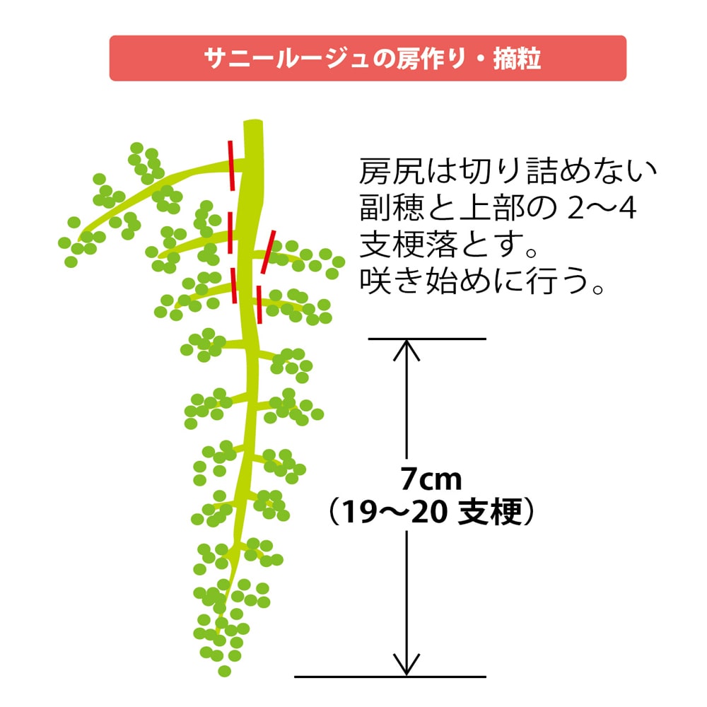 花ぶるいしやすいので、ジベレリン処理による種無し栽培がおすすめです。ジベレリン処理で果粒が肥大して、果粒が密着した房が安定して収穫できます。1房300~400g暗いです。