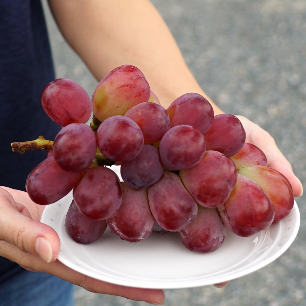 果皮が薄いので雨や湿度で裂果しやすいので、雨よけ栽培と25~34粒くらいに摘粒するのがおすすめ。