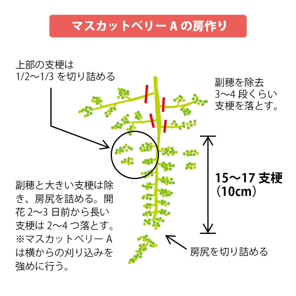 ジベ処理しない場合、花ぶるいしないように房づくりをします。時期は花穂が伸び切ったころ、花が1~2輪咲いたころに房づくりします。
