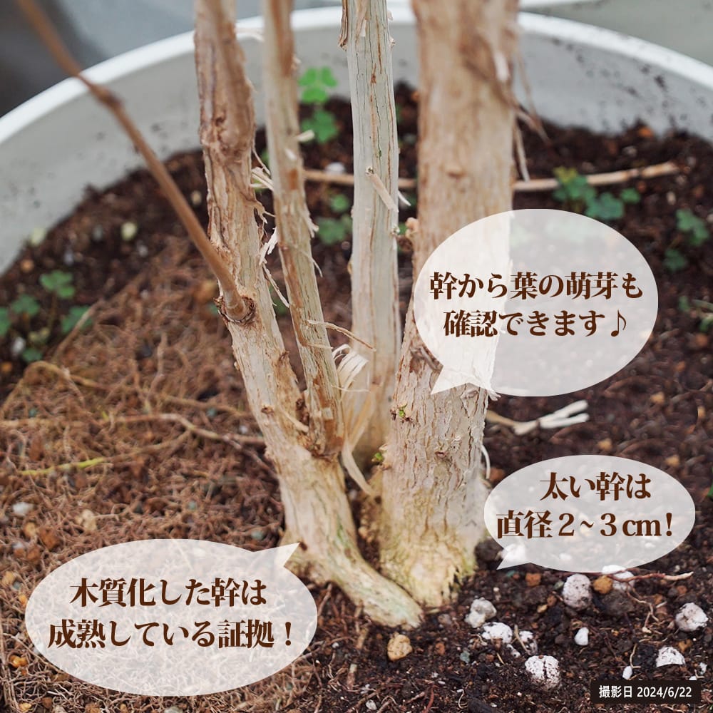 枝の節に丸い樹液の固まりのようなもや、白い綿のようなものがつ事があります。古くなった歯ブラシなどで落として、スミチオン乳剤などを散布しておきます。