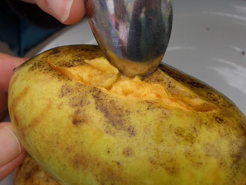 収穫したばかりだと果肉も硬いですが、1か月程度おいておくと熟して柔らかくなってきます。