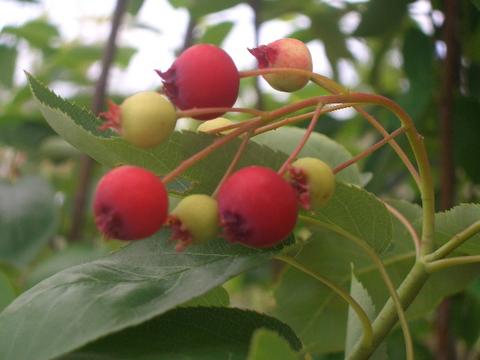横に枝を大きく伸ばし、見ごたえのある品種。花もほんのり極淡くピンクを帯びる可愛らしいものです。樹高はだいたい4~5m、葉張りは6~7mになると思われますが、まだ調査中です。果実の大きさは10mm程と、少し小さめですが甘いです。です。生食するほか、ジャムや果実酒にしても楽しめます。