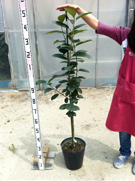 商品は3年生接ぎ木ポット大苗です。根鉢の部分も含め高さ約149cmです。根鉢の大きさは8号(直径24cmポット)です。3年生苗とは苗木ができて3年目の苗です。