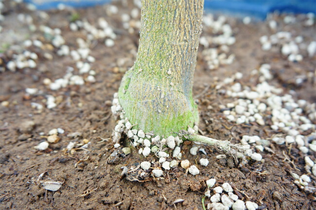 肥料は花がつき始めてから与え始め、収穫量に応じて少しずつ量を増やしていきます。おすすめの有機肥料は みかんの肥料です。3月上旬と7月上旬に追肥として速効性の化成肥料(元気玉)を与えます。12月頃に寒肥として有機肥料のみかんの肥料を与えます。
