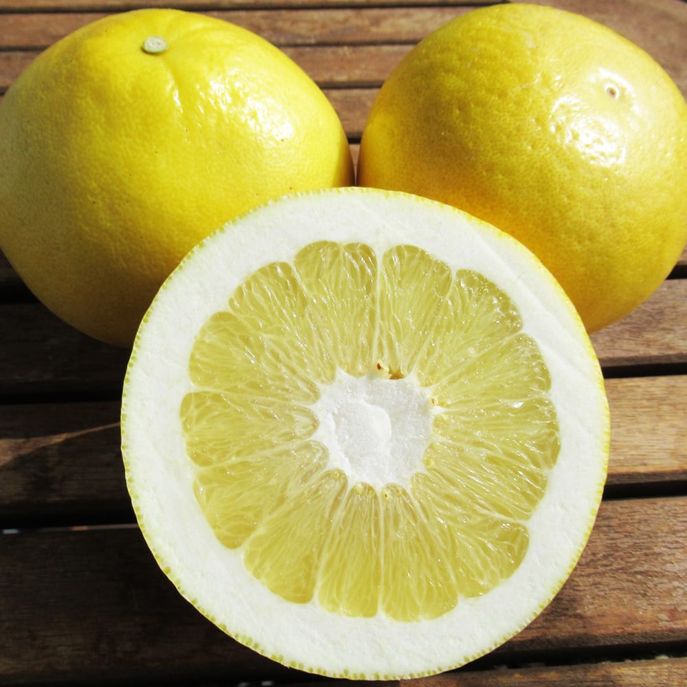 花も実も大きな柑橘。酸味が少なく甘みも多目でおいしいです。土佐文旦(トサブンタン)は文旦の中では小さい部類になります。皮が比較的薄くて味が良いです。果汁が多く、酸味と甘味のバランスが良く、口当たりも良いのでパクパク食べれます。小玉のものは味が濃厚になりやすいでので、果実の大きさで食べ比べしてみましょう。大きなものでは1kgの果実が実りますが、おおむね700gくらいまでの大きさの果実が実ります。