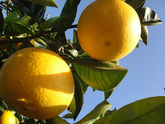 八朔(はっさく)の熟期は1月上旬で果汁は少ないですが、房からの肉離れが良く、パリッとした食感の日本人好みの味です。特有の渋みと上品な甘さとさわやかな酸味があります。