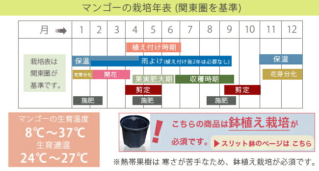 マンゴーは、10℃以下で生長が止まります。地植えの際は温室で、家庭栽培の場合は、鉢植え栽培が必須になります。
