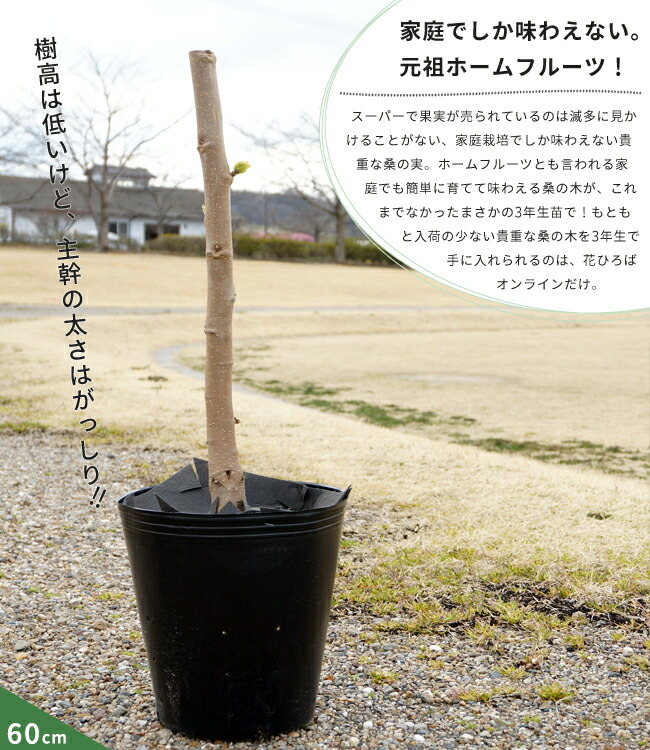 桑は蚕のエサとして昔はよく植えられていた落葉高木で、別名マルベリーともとも呼ばれます。果実は、スーパーで並ぶことはほとんどなく、家庭でしか味わえない、まさに元祖ホームフルーツです。生食のほかにもジャムやゼリーなどに加工して食べられます。やせ地でも育ち、コンパクトに鉢植えでも楽しめるので初めてのかたにもおすすめの果樹です。