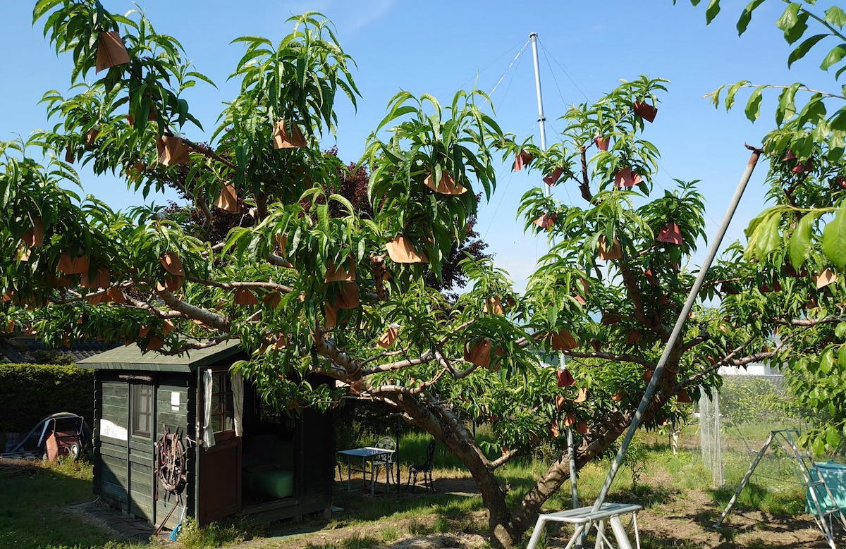 古い枝がハゲやすい。夏の肥大時期に日照量が多く、雨が少なく、昼夜の寒暖差があると最高の桃がとれる。