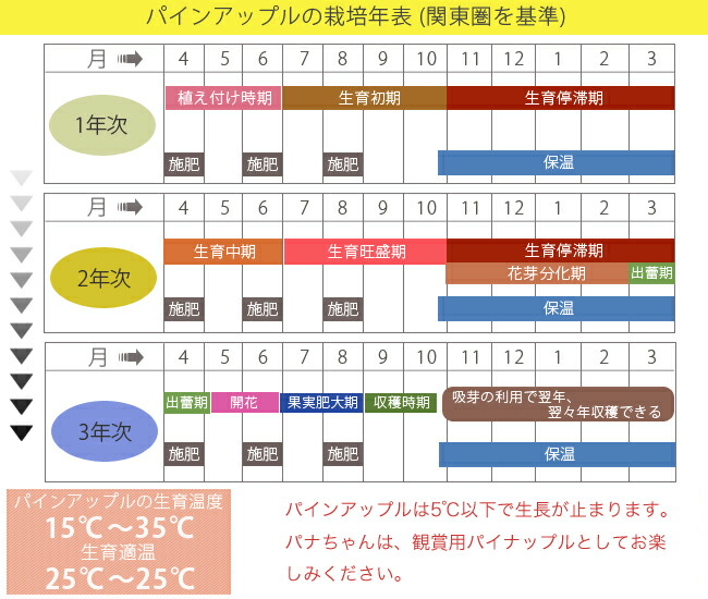 パインアップルは5度以下で生長が止まります。日本の気候では屋外越冬ができませんので、10月下旬から4月までの期間は室内で栽培してください。