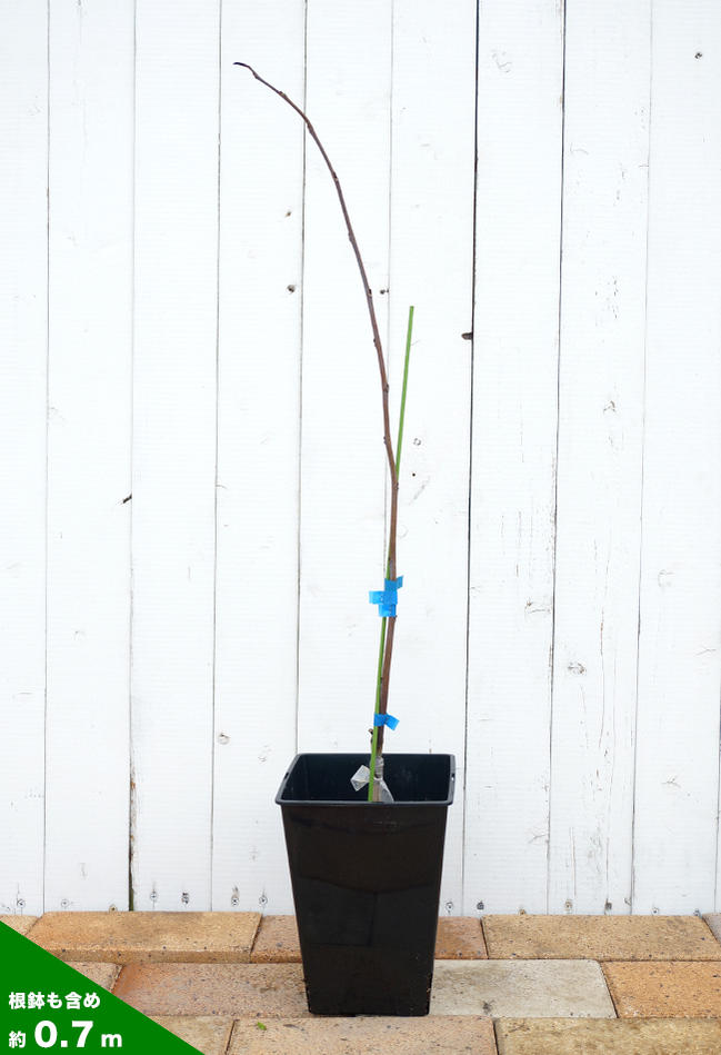 苗木は1年生の接木苗です。オリジナル角鉢に仮植えしてあり、鉢部分も含め、高さ0.7m前後くらいです。落葉期は葉がついておりませんが春に芽吹いてきます。