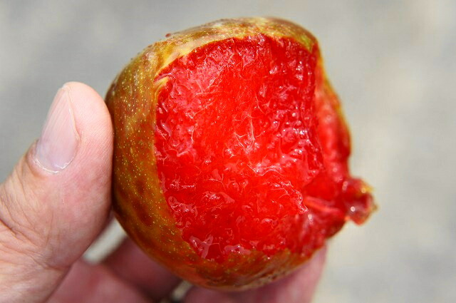 ソルダムは大石早生に比べて実が大きく、一般的に市場に出回る際の果皮の色は、緑色のままが多いですようが、相反して、果肉は鮮やかな赤色です。緑と赤のコントラストがとても綺麗ですよ♪追熟すると果皮も赤くなり、やわらかさが出てみずみずしい食感に変わり、酸味もやわらいで甘味が強くなります。