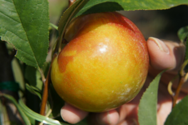 秋姫(あきひめ)は丸い形の物からやや先が尖った形の物まであり、果皮は全体に黄色い地色に赤紫から赤褐色に色着きます。着色の過程では色付き始めた面に黄色い斑点が残ります。果肉は黄色く、優しい歯ざわりが感じられます。糖度も14度前後と甘いので、酸味は穏やかで渋みなどはありません。本種はスモモのプリンセスと呼ばれ、甘酸っぱいスモモがお好きな方は、収穫後そのままガブリとお召し上がり下さい。柔らかくて甘めのスモモがお好きな方は、常温で追熟させて、少し柔らかくなった頃が完熟の目安です。