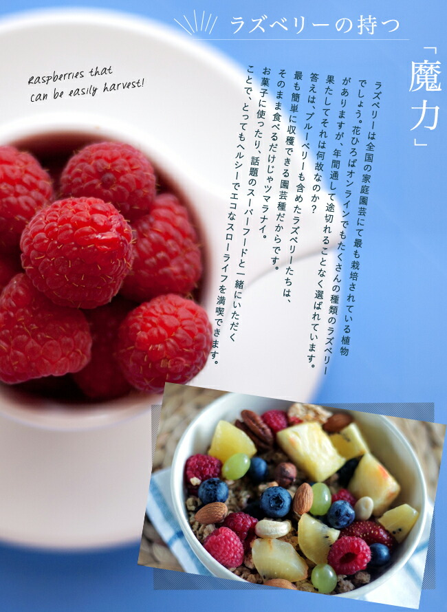 優れた風味・甘味・酸味がありジャムや洋菓子などによく用いられています。果実は小さな球形の実の集合体で、一つ一つに種子が入っています。種はゴマ程度の大きさで、種ごと食べられるますが、種はやや口当たりが悪いです。この集合果は木質の果床からまとまった状態で外れます。日本国内でも園芸・ガーデニングで栽培されています。寒さに強いけど、夏が苦手なので関東以西の暖地では夏は風通しを良くし、西日をさけた半日陰での栽培をお願いします。