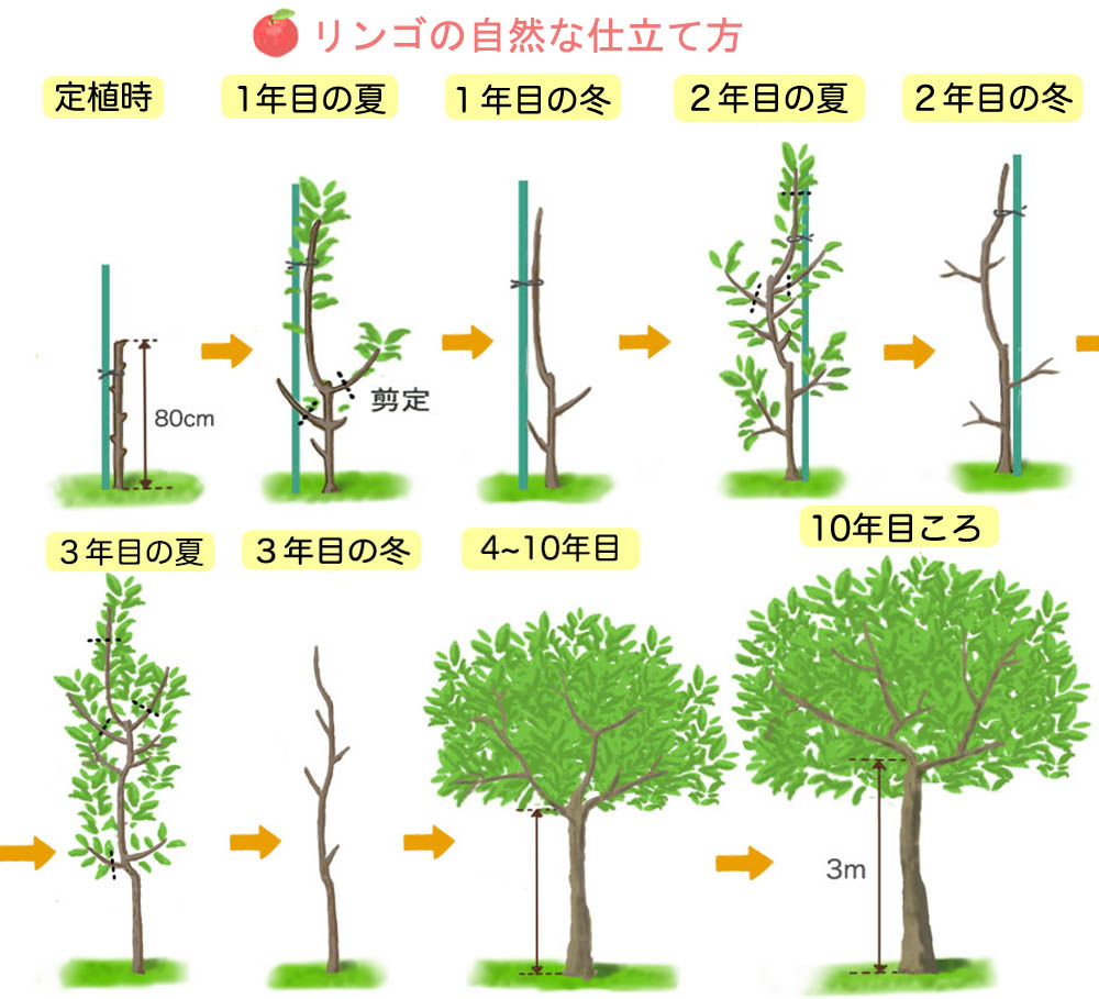 YD苗では、1mくらいの植え付け間隔で大丈夫です。通常台木では仕立て方にもよります。自然樹形で剪定をしないで大きく育てても良い場合は間隔4~5mあけます。