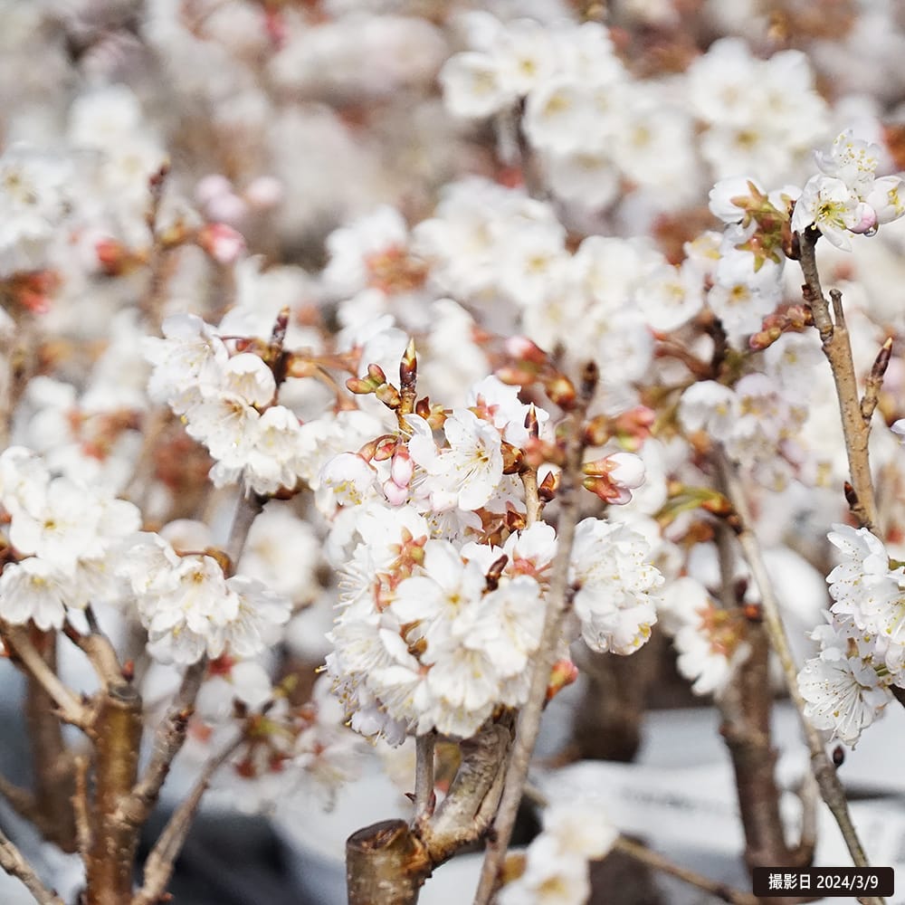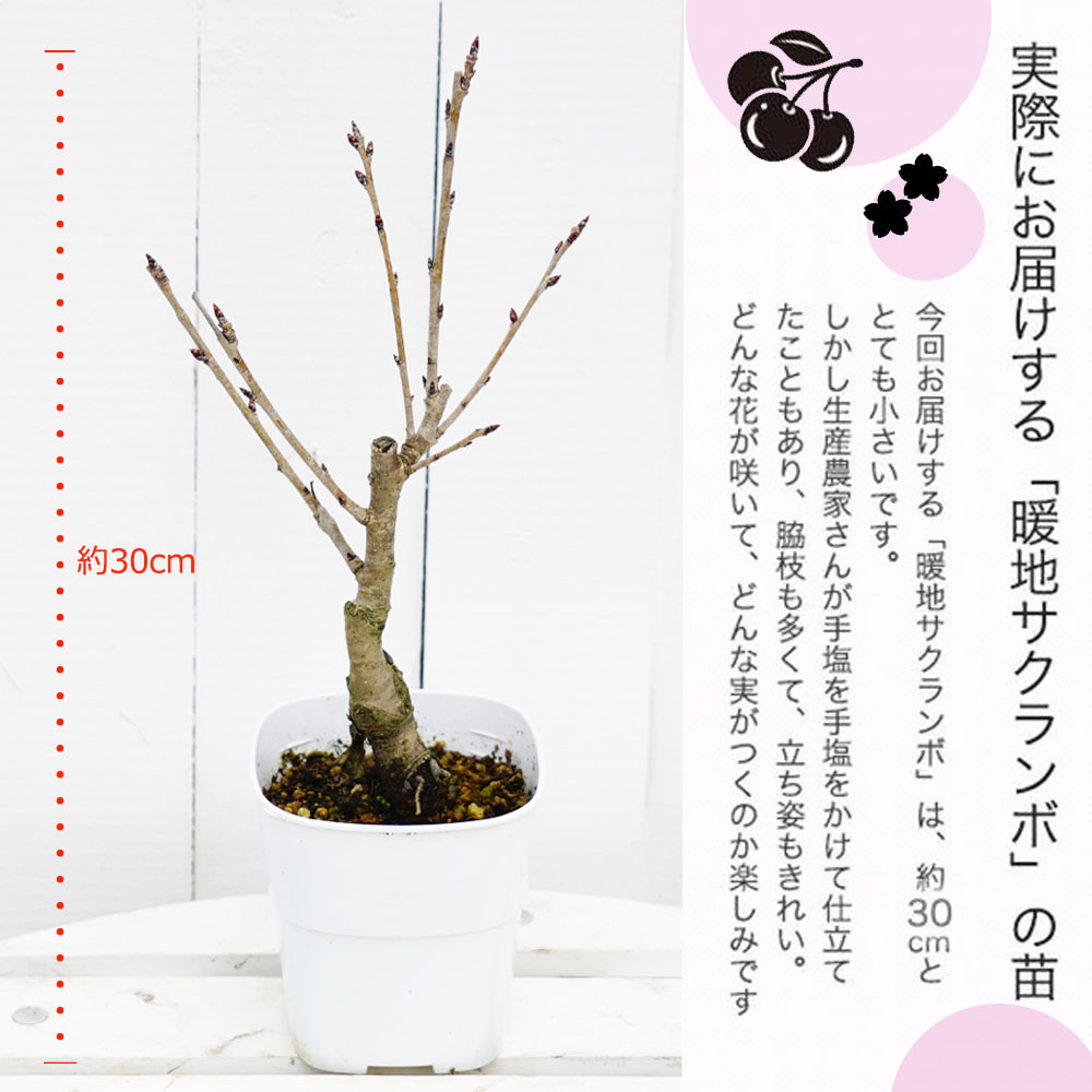 3月頃に白い花が咲く早咲きで、花が終わって4月下旬~5月上旬頃になると赤い小さなサクランボの果実が楽しめます。開花時期に晩霜害などでマイナス2度以下になると、おしべが凍死して結実しません。暖地向きのサクランボです。植木としての鑑賞価値も高く、記念樹やシンボルツリーとしてもオススメです。