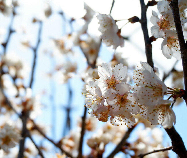 3月頃に白い花が咲く早咲きで、花が終わって4月下旬~5月上旬頃になると赤い小さなサクランボの果実が楽しめます。開花時期に晩霜害などでマイナス2度以下になると、おしべが凍死して結実しません。暖地向きのサクランボです。植木としての鑑賞価値も高く、記念樹やシンボルツリーとしてもオススメです。