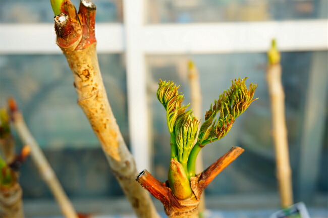 新芽が3~5cmほどに生長したころが収穫時です。枝先の頂芽と枝の側芽があり、どちらも収穫できますが、頂芽のほうがおいしいです。頂芽が先に発芽し、上から順番に側芽が発芽します。