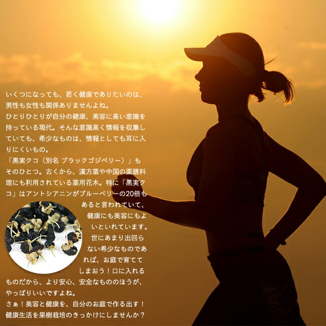 珍しい、黒い果実がなるクコです。別名「ブラックゴジベリー」とも呼ばれ、アントシアニンの含有量がブルーベリーの20倍もとも言われています。古くから、乾燥させた果実は漢方薬や料理にも利用されてきた、健康に良いと言われる果樹です。生産、収穫量が少ないことから、果実は希少なものとされていて、とても高値で取引されることもあります。日本でも、乾燥した黒実クコが健康茶としても出回っていて、健康志向な現代におすすめの果樹苗です。