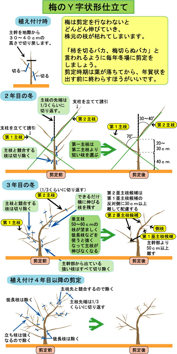 地際から40cmくらいで切り詰め、主幹から20cmおきに120度くらいの角度で斜めに2~3本の枝を伸ばさせて木が広がるように育てます。