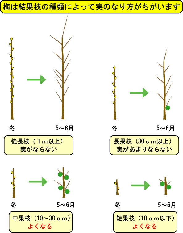 花芽は前年に伸びた枝の葉腋に花芽と葉芽が分かれて夏につき、翌春に開花し結実します。徒長枝は間引くか短く切り戻し、そこから短果枝を多めに出させるようにします。
