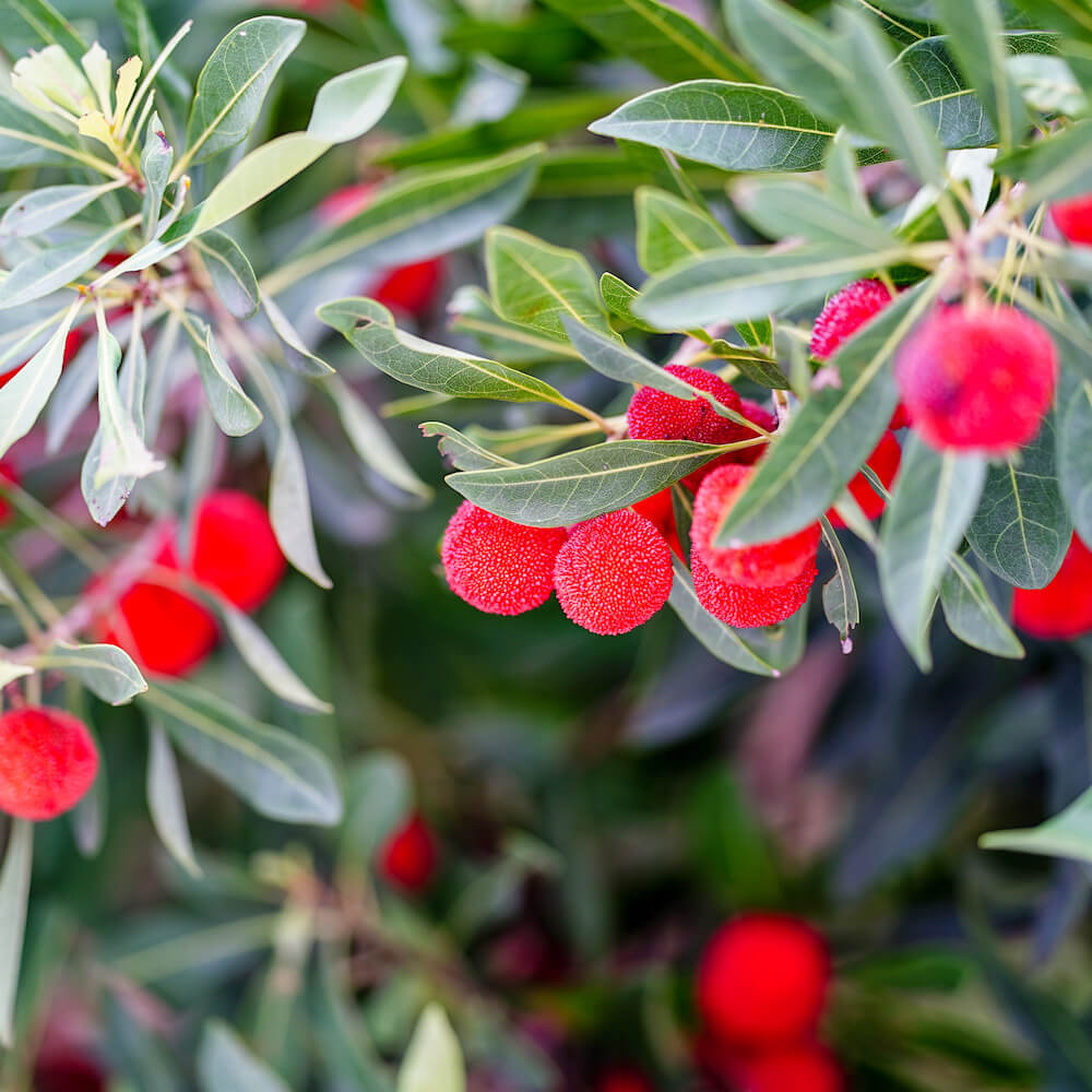 美しい赤い実をたくさんつけます。常緑果樹で、真っ赤な実をぶら下げた姿が愛らしく、お庭のシンボルツリーにもおすすめです。