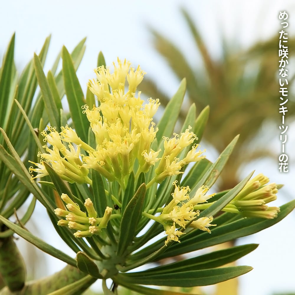 「セネシオクレイニア」は、モンキーツリーとも呼ばれ幹に触ると幸せになるという言い伝えがあります。真夏と真冬の年に2回休眠するおもしろい品種です。夏の休眠期に葉を落とします。めったに咲きませんが、春から秋にかけて枝先に筒状の集合花が咲くことがあります。花の後にはタンポポのような綿毛がある種が付くことも。