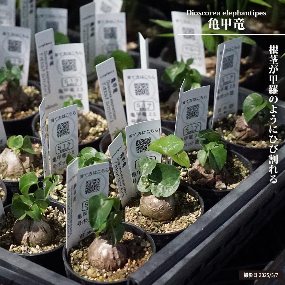 「亀甲竜(きっこうりゅう)」は、南アフリカの乾燥地帯に自生する塊根植物です。日本でも古くから愛好家のあいだで栽培されてきた人気の植物で、専門店では定番品として扱われています。土中に塊根を形成し、根とつるを伸ばして葉を展開しています。大きくなると塊根の上部が土中から出てきてひび割れを起こし、カメの甲羅のように見えることが和名の由来です。観賞価値を出すために塊根部を土の上に出すように植えつけられてますが、本来は地面に埋まった状態で育ちます。ひび割れ方には個体差があります。
