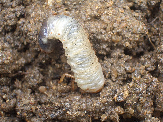 孵化した幼虫は腐葉土や堆肥、根を食べて育ち、カブトムシの幼虫の小さい感じに育っていきます。