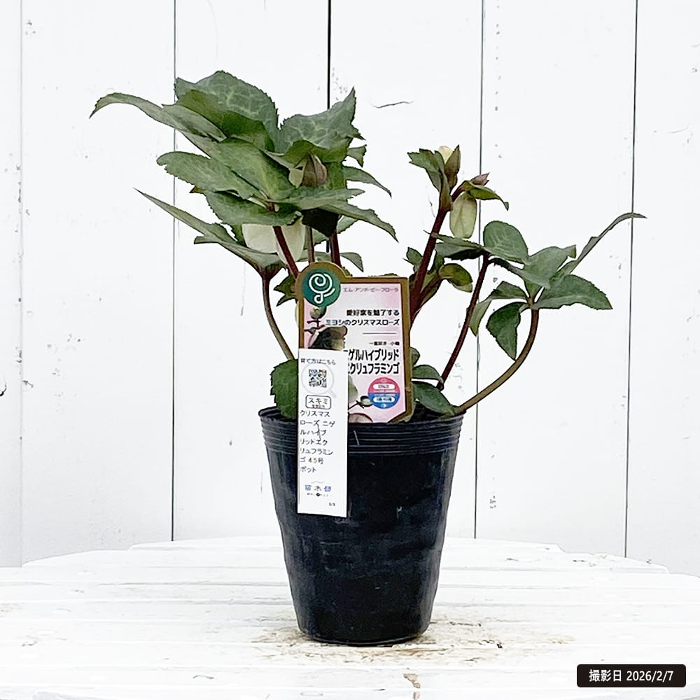 「エクリュフラミンゴ」はニゲルとの交配種で大理石模様の光沢のある美しい葉をもつため、花がない時期でも楽しめます。花色は白い花弁の縁に赤みが差す優しくも清楚なイメージ。花弁は白からクリーム色へと変化します。