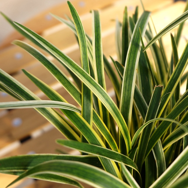 斑入りヤブラン(フイリヤブラン)の代表的な種類で葉が長く美しく、黄色やクリーム色の縦じまが入ります。細長くシュッとした緑の葉に、黄色味を帯びた白い縁取りが入っているため、明るい雰囲気になります。ゴールドバンテッドとも呼ばれます。日当たりが悪く暗い雰囲気になりがちな場所にはもってこいの品種です。和風・洋風どちらのお庭にも馴染みやすいですよ。