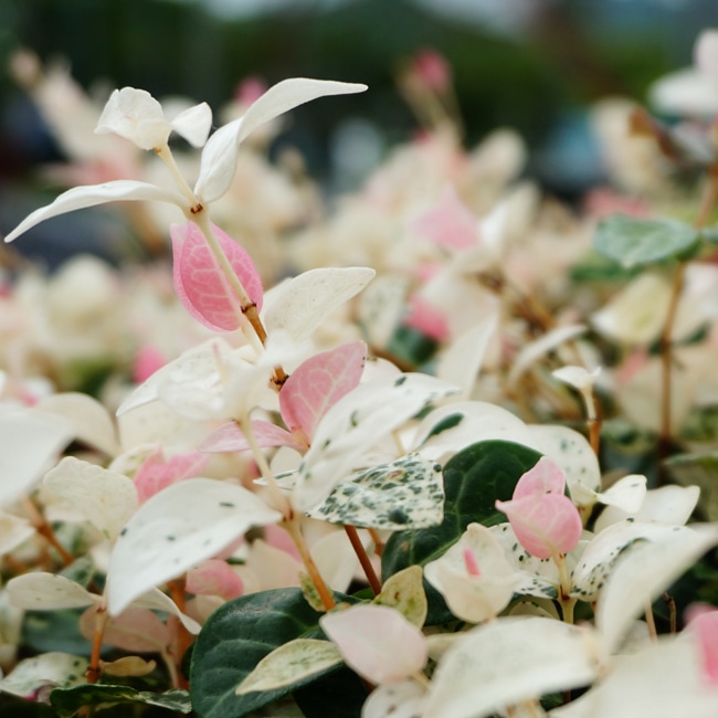 ピンク・白・緑と花のように鮮やかな色を繰り広げる葉っぱ。秋から冬にかけて真っ赤に紅葉し、一味違った美しさを見せてくれます。小さな隙間に植えるだけでもちょっとしたアクセントになり、寄せ植えの鉢やお庭の雰囲気を明るくしてくれます。つる性ですが他の植物に比べて成長が緩やかなので、周りの植物を邪魔しません。『ハツユキカズラだけを残して、周りの植物を季節ごとに植え替える』なんていう楽しみ方もしていただけす。