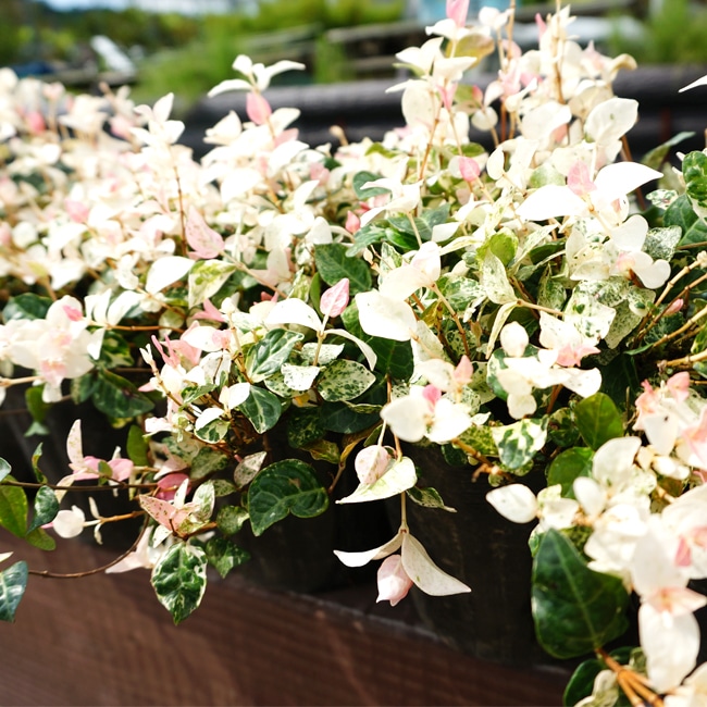 ピンク・白・緑と花のように鮮やかな色を繰り広げる葉っぱ。秋から冬にかけて真っ赤に紅葉し、一味違った美しさを見せてくれます。小さな隙間に植えるだけでもちょっとしたアクセントになり、寄せ植えの鉢やお庭の雰囲気を明るくしてくれます。つる性ですが他の植物に比べて成長が緩やかなので、周りの植物を邪魔しません。『ハツユキカズラだけを残して、周りの植物を季節ごとに植え替える』なんていう楽しみ方もしていただけす。