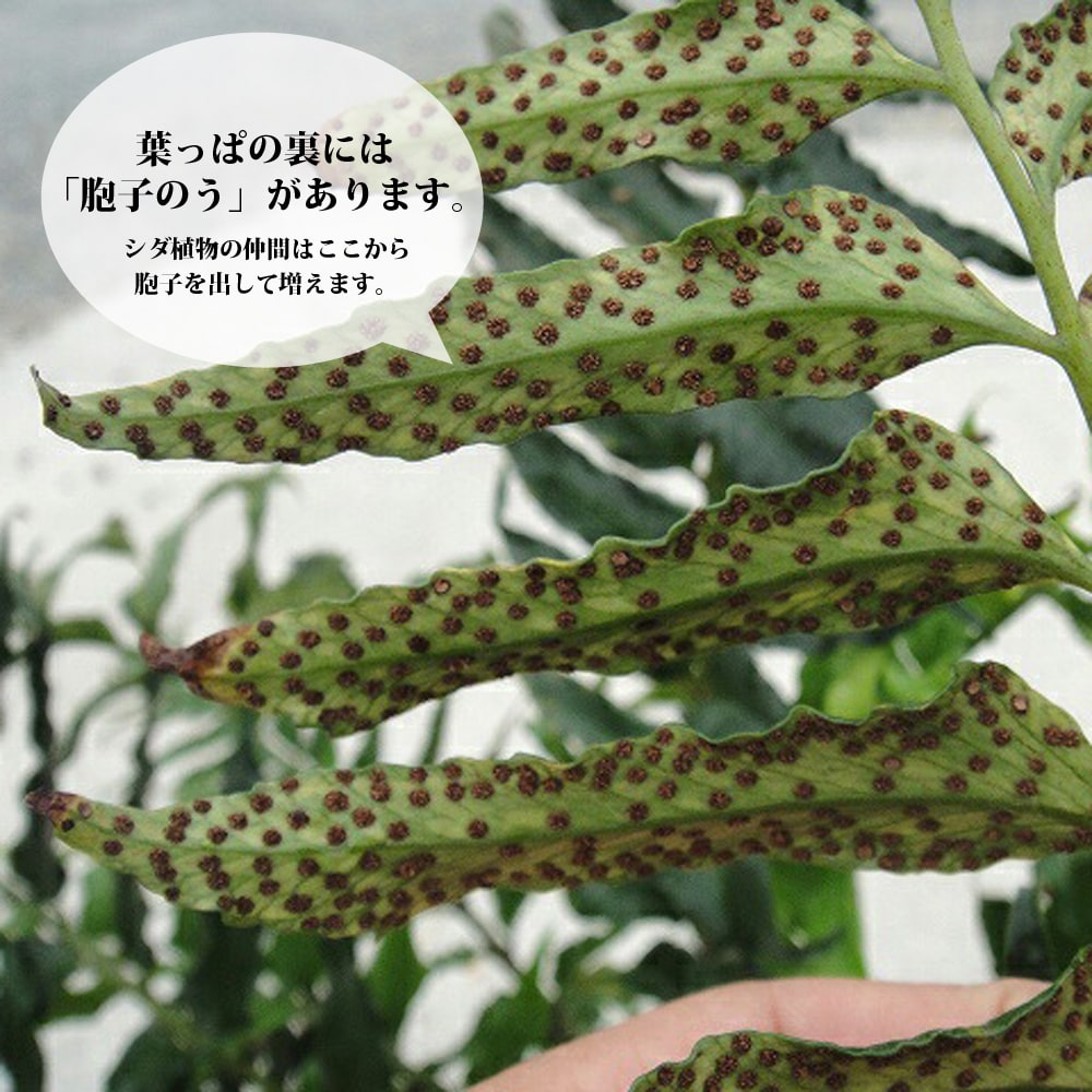 ※シダ植物には葉っぱの裏に胞子という丸く、ツブツブのものがあります。これは病気でも害虫や卵でもありません。シダ植物やコケ植物は胞子が作られ胞子が湿った地面などに落ちると発芽します。