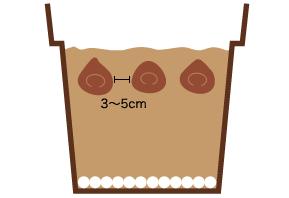 植え付け間隔は3~5cmくらい、深さは球根が隠れるくらいの深さで植えつけます。