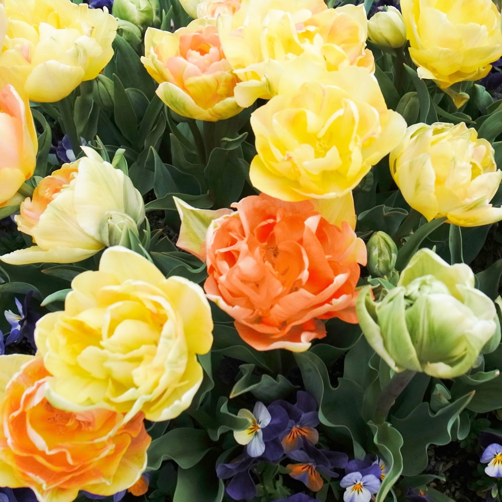 チューリップは、多彩な園芸種が存在しています。一重咲きと八重咲きがあり、花弁の形は丸いもの、尖ったもの、フリル状のものなど、色は青以外はほぼすべて存在するといっていいほど多様です。生産地ではオランダが最も有名。富山県と新潟県の名産品でもあります。イラン、アフガニスタン、オランダ、トルコ、ハンガリーの国花にも指定され、世界中で愛されています。オランダでは球根が食用にされる品種もあるのだとか。品種が多いため、系統も多く複雑ですが、最もポピュラーなのはトライアンフ系のチューリップです。