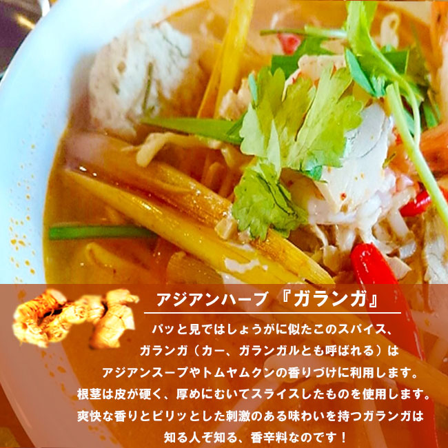 多くの日本人には馴染みのないアジアンスパイスかと思います。タイ料理に興味を持っていたりしないとなかなか出会えない謎めいた香辛料とも言えます。簡単に言うとショウガに似た根茎を調味料として利用したり、アジアンスープやトムヤムクンの香りづけに利用します。根茎は皮が硬く、厚めにむいてスライスしたものを使用するそうです。爽快な香りとピリッとした刺激のある味わいを持つガランガは、一度知ったら忘れられないかも?ショウガも殺菌効果や体を温める作用に優れていますがガランガも同じような特徴をもっているんだとか。