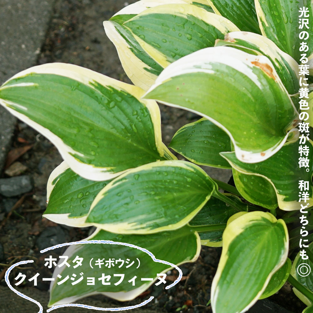 クイーンジョセフィーヌは、光沢のある緑の葉に黄色の斑が入るキレイな品種です。葉色、斑の入り方、芳香、と魅力たっぷりなギボウシ。和風・洋風ガーデン、どちらでもよく合います。一株でも葉の枚数が多いので存在感があります。半日陰または日陰を好みますので、シェードガーデンに最適。丈夫なので初心者にも失敗なく育てられます。