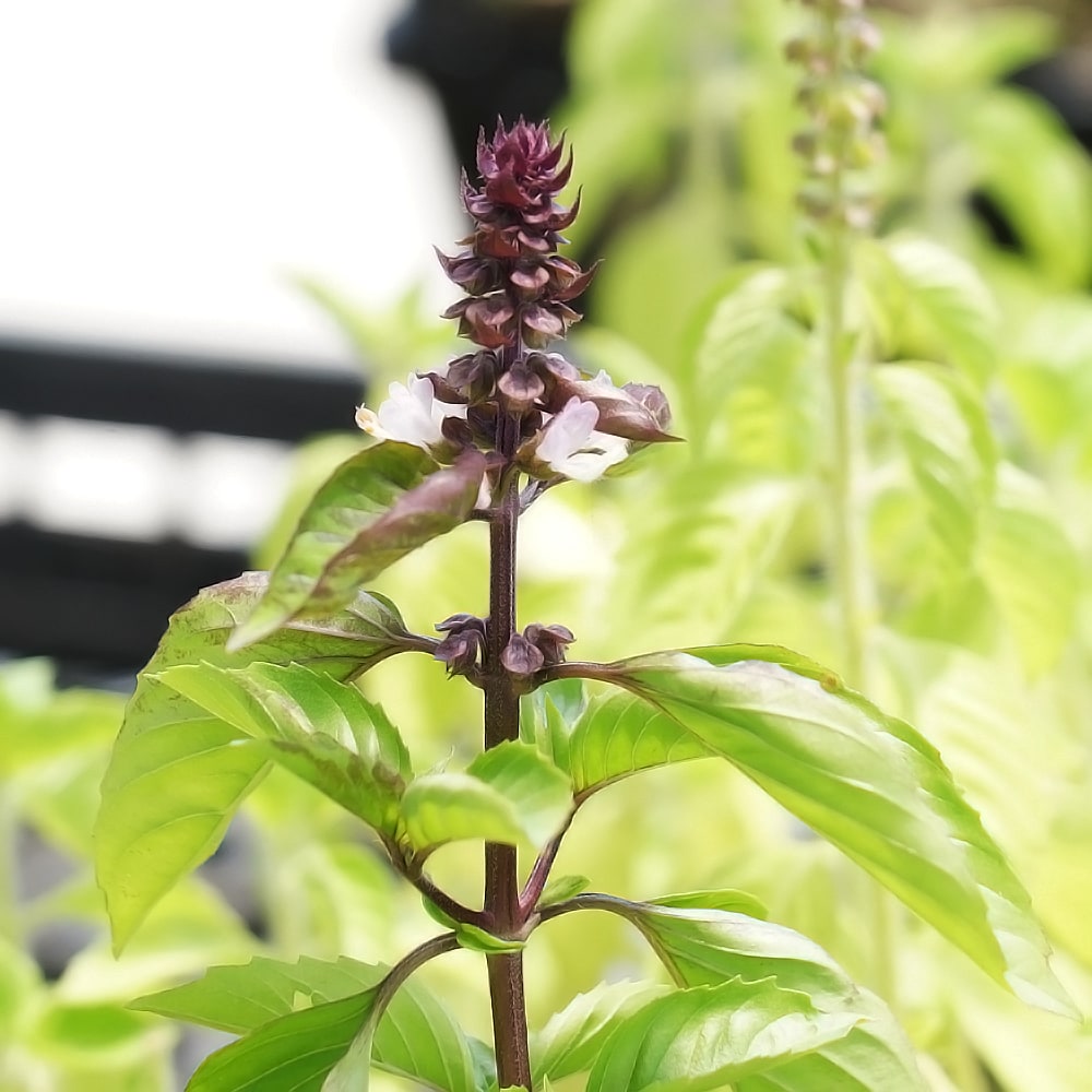 シナモンバジルは、スイートバジルと同じシソ科の1年草で、茎の色が紫色で葉の先が少し尖った形状をしています。