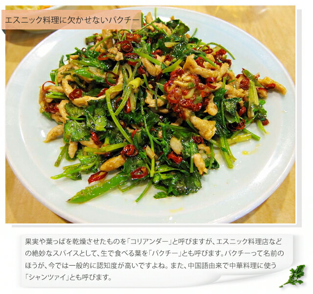 パクチーとは地中海を原産とする香味野菜です。一般的には果実や葉を乾燥したものを香辛料として「コリアンダー」と呼び、エスニック料理などで生食される葉を指して「パクチー」と呼ばれます。また、中華料理で使う生菜は「シャンツァイ」と呼びます。